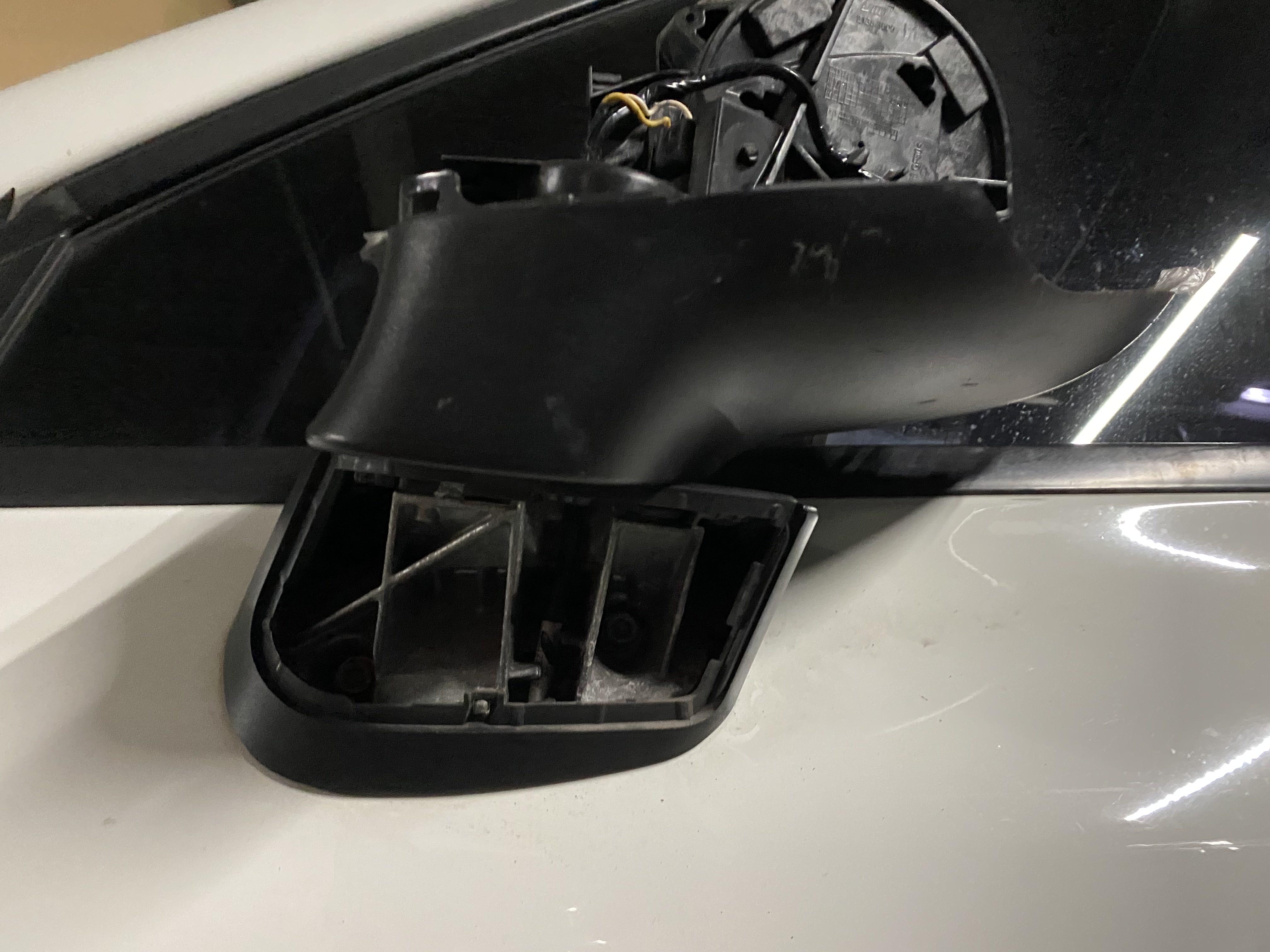 사진에도 보는 바와 같이 사이드 미러가 폴딩되어 있는데 배선을 이용하여 12V전압을 인가하면 폴딩이 펴지거나, 반대 극성을 주면 폴딩이 접히기 때문에 사이드를 전원인가를 해서 폴딩을 핀상태에서 작업하였다. 또 사진에는 없지만 내부의 미러 커버, 턴 시그널 램프 어셈블리등이 결합할수 있도록 되어 있는 핀들이 대부분 부러진 상태여서 일부는 순간접착제를 사용하여 붙여두었다.