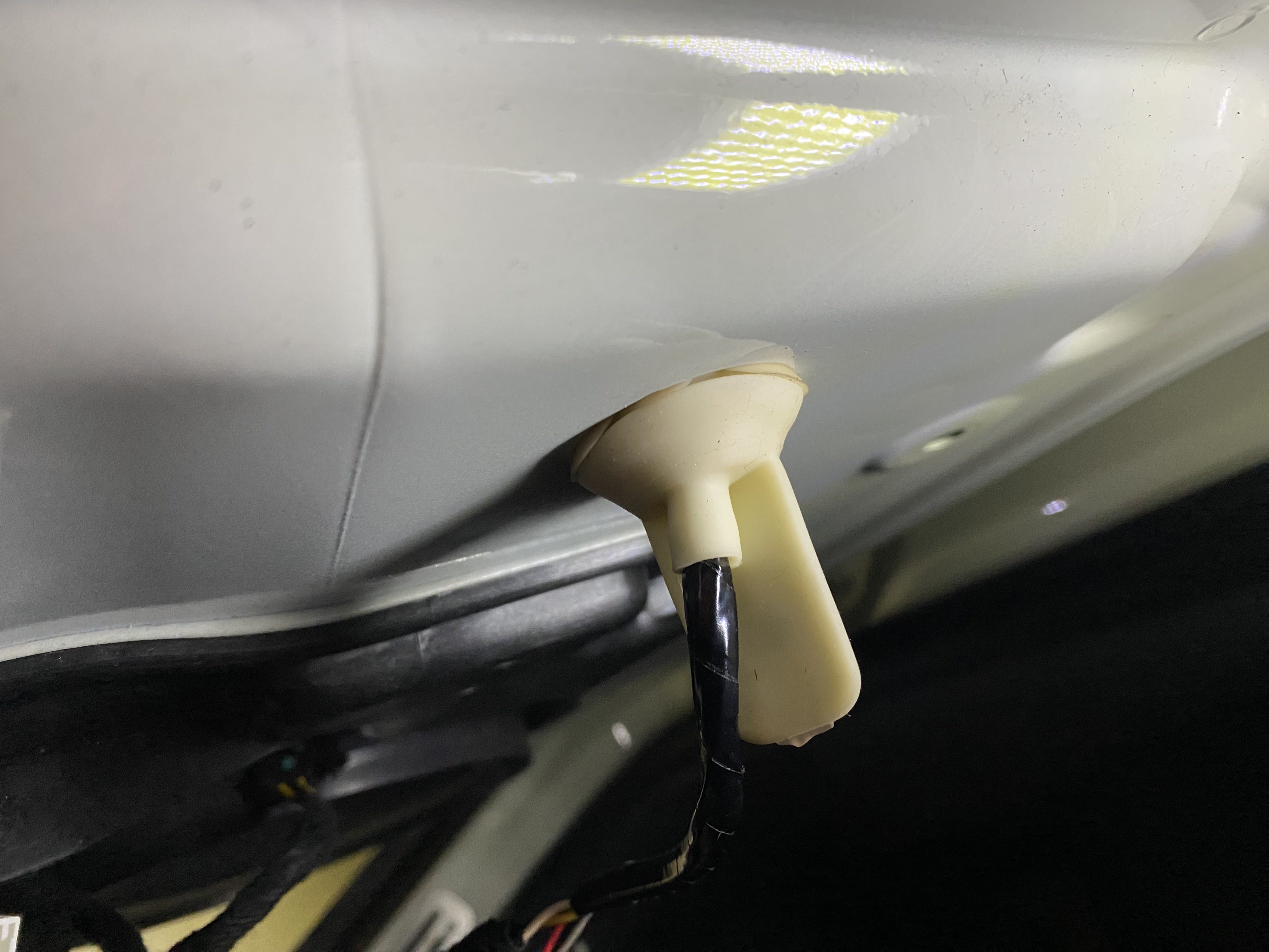 도어트림 탈거 후 안쪽에 사이드미러 어셈블리와 연결된 선과 방수를 위한 고무패킹이 보이는 데 커넥터 2개를 탈거 한 후 외부쪽으로 빼내어 사이드 미러 어셈블리를 통채로 차량에서 분리한다.