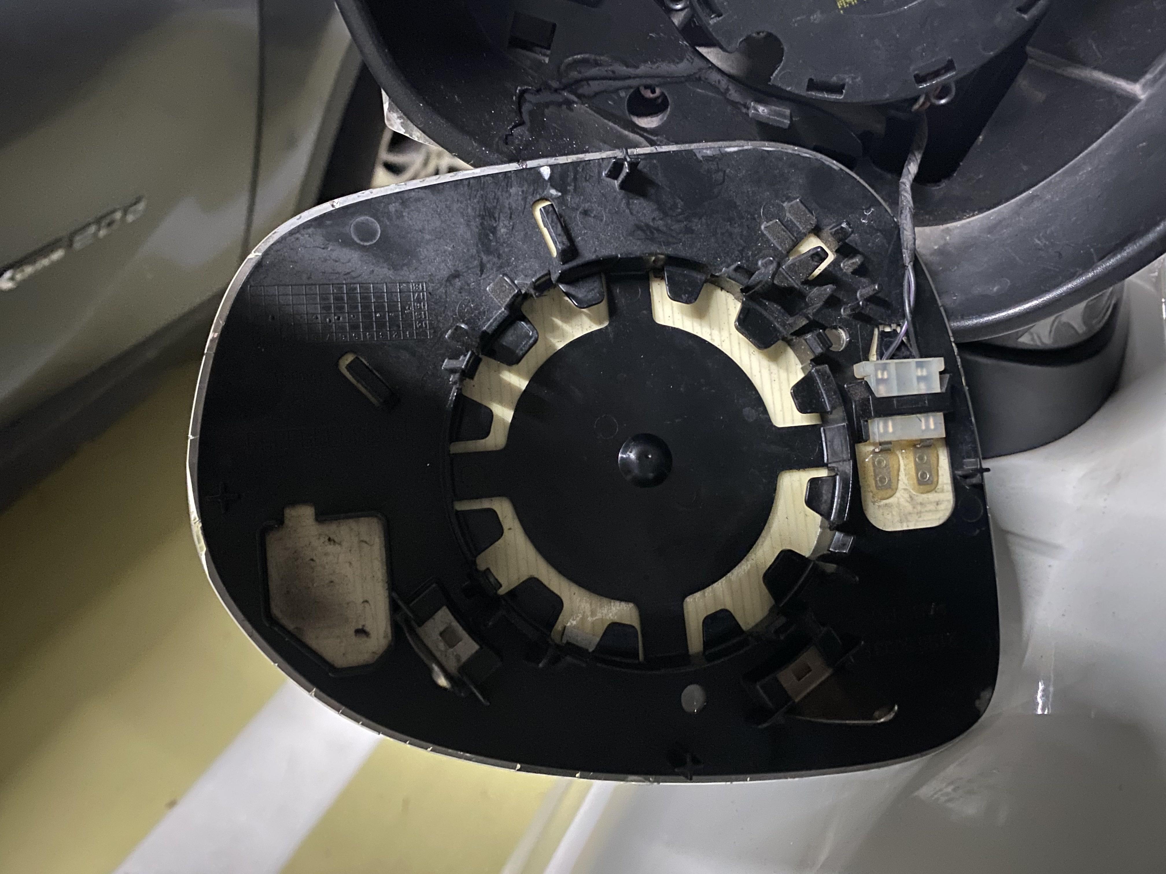 어셈블리 탈거전에 깨진 사이드 미러를 안전을 위해 먼저 탈거하는 것이 좋을듯 해서 탈거 하였다. 헤라를 사용하여 일반적인 차량의 사이드 미러 탈거하듯 미러 안쪽에서 제끼면서 탈거하면 상하좌우로 움직이는 사이드미러 모터의 연결부과 탈거되며 2선의 열선 커넥터가 연결되어 있어 이부분도 탈거해서 미러만 제거한다.