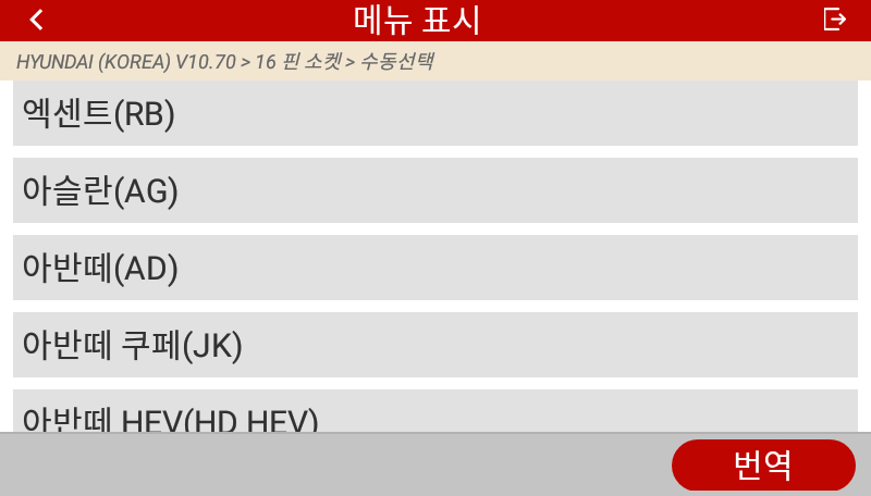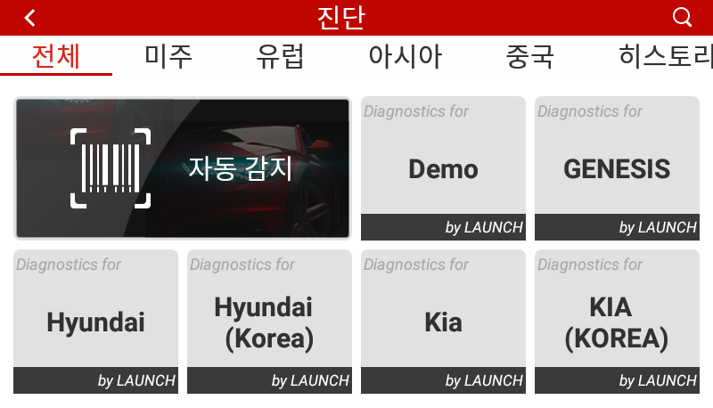 초기 메뉴의 진단 항목을 터치하면 각 지역별 차량브랜드를 선택하는 화면이 나오는데 현대/기아용이기 때문에 어느 지역을 터치해도 동일 브랜드만 나온다. 현대/기아용은 제네시스 차량도 진단할 수 있고 Korea라고 되어 있는 것은 내수용을 그렇지 않은 메뉴는 수출용 제품을 진단할 수 있으므로 참조한다. 히스토리 메뉴는 진단 시행 후 진단했던 기록들을 남아 추후 진단할때 바로 진단했던 차종으로 빠르게 접속할 수 있어 편리한 메뉴이다.