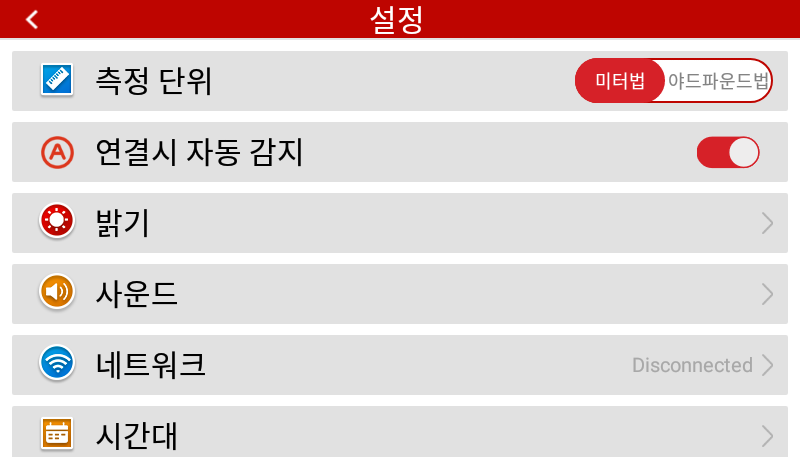 측정단위나 사운드, 네트워크등을 설정할 수 있는 메뉴로 옵션으로 보면 좋을듯 하다. 이 중 아쉬운 점 하나는 측정 단위인데 설정값을 미터법이나 야드/파운드법으로 설정해 두면 해당 단위로 표시되지만 본인과 같이 미터법을 쓰고 단위 중에 미터법이 아닌 측정단위가 더 익숙한 경우(예:PSI등)은 측정단위를 변경 후 다시 봐야 한다는 점이다. 진단기에 따라 해당 측정 데이터 항목별로 단위를 변경할 수 있는데 비하여 아쉬운 점이다.