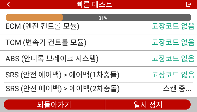 해당차량과 연식과 엔진형식을 선택하면 전체모듈을 진단할지 특정 모듈을 선택하여 진단할지 선택할 수 있고 아래와 같이 전체 시스템에 대한 진단을 수행하게 된다.