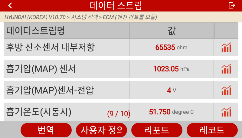 각 모듈별 데이터 값을 측정할 수 있는 항목은 굉장히 많기 때문에 모두 소개하기는 어렵고 테스트로 엔진 컨트로 모듈에 특정항목에 대한 샘플을 보여주는 것으로 갈음하도록 한다.